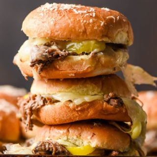 These Pulled Roast Beef Sliders are an absolutely amazing dinner or party recipe! With juicy, savory shredded beef, melty cheese, and banana peppers, these sandwiches are always gobbled up in no time.