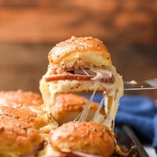 Hawaiian Roll Sliders are loaded with ham and Swiss cheese then topped with a sweet and tangy honey mustard glaze. Make these easy Ham and Swiss Sliders for your next tailgating party!