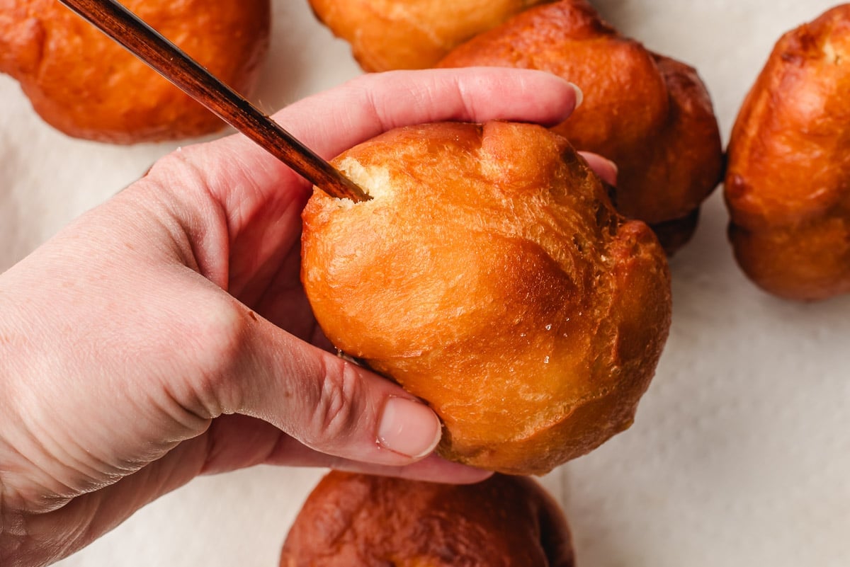 - When the donuts are cool enough to touch, use a chopstick to poke a small hole about 3/4 of the way through the donut. I like to twist it around slightly to make sure there is enough space for the filling. Fill a piping bag with strawberry jam, insert the tip into the donut and squeeze until the jam starts to pool at the top. Repeat with remaining donuts.
