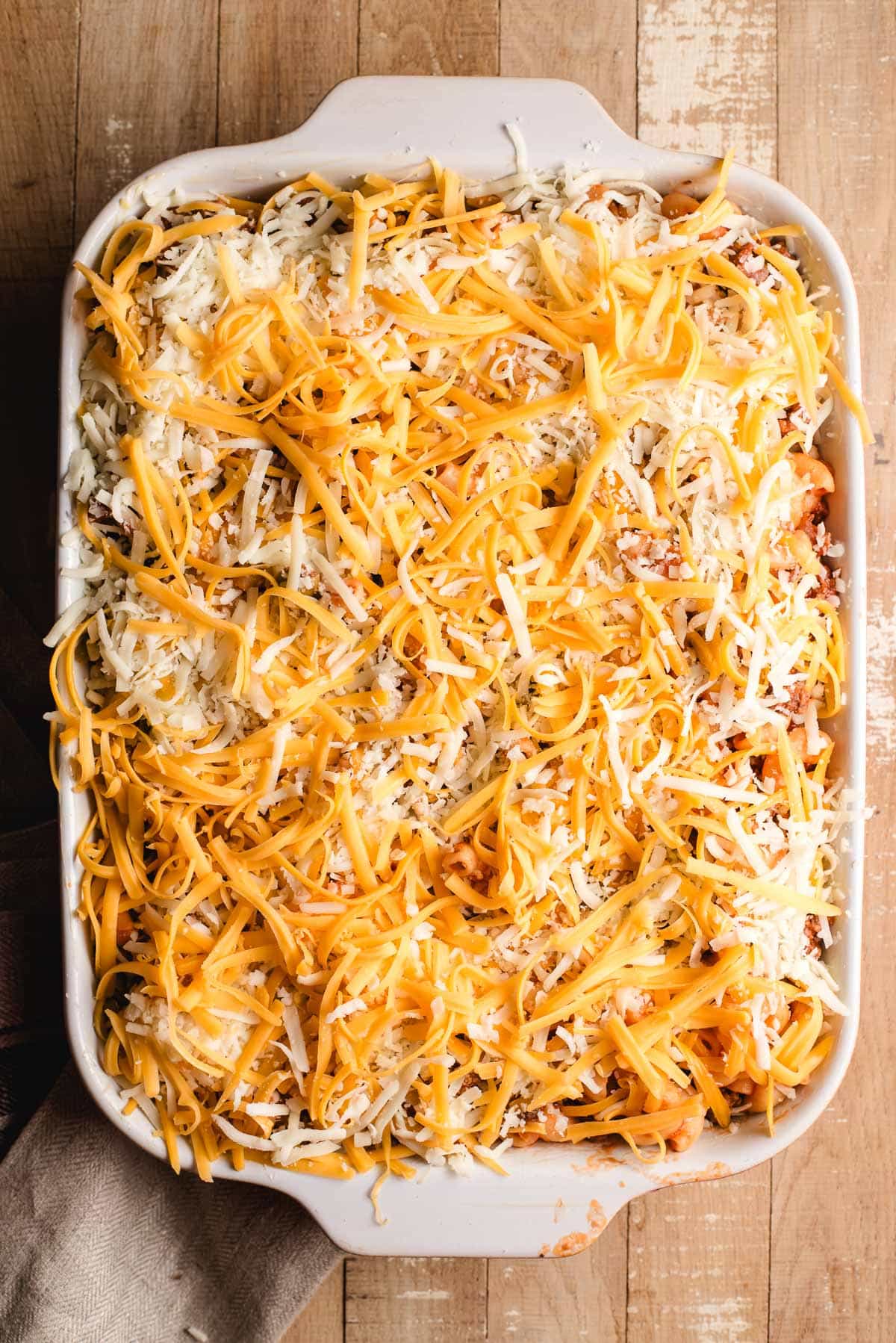 - Combine the meat mixture and noodles in whichever pot or skillet is biggest and stir to combine. Stir in 1 cup of cheddar cheese and 1 cup of Italian blend. Pour the mixture into the prepared dish. Top with the remaining 2 cups of cheese. Bake for 30-35 minutes, or until cheese is golden and melted. Top with finely chopped parsley for serving, if desired.