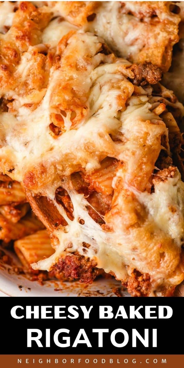 Easy Baked Rigatoni is a cheesy baked pasta with a rich and meaty sauce. This recipe is easy enough for a weeknight dinner, but fancy enough to pull out for dinner parties and holiday events. No one can resist a big, bubbling dish of this easy ground beef rigatoni!