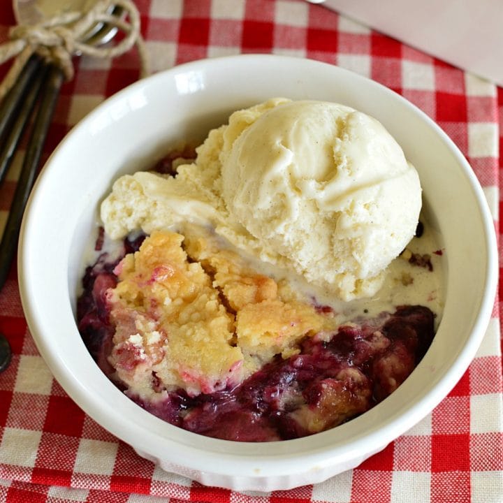 Blueberry Rhubarb Dump Cake has the perfect mixture of tangy rhubarb, sweet juicy blueberries, and a crunchy topping! Adding a scoop of vanilla ice cream is like adding icing to the cake! Oh, and since this only takes 6 ingredients it’s easy as pie to make!