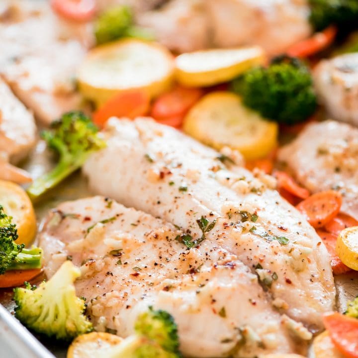 Get a healthy dinner on the table in less than 30 minutes with this easy Sheet Pan Baked Tilapia. This recipe is also great for meal prep!