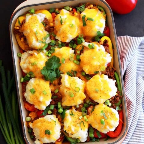 Stuffed peppers in only 30 minutes? Totally possible! These Southwest Skillet Stuffed Peppers are part shepherd’s pie, part stuffed pepper and seasoned like a taco.