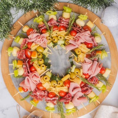 Filled with savory meats, cheeses, olives, and colorful veggies, this Christmas Wreath Charcuterie Board doubles as a delicious holiday appetizer & a beautiful centerpiece.