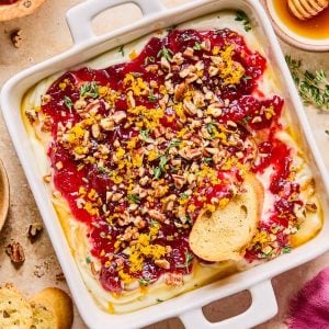This 10-minute prep honey whipped ricotta dip topped with cranberry sauce (or your favorite jam!), pecans and more will be a favorite appetizer for any party. The layers of flavor, with the rich creamy ricotta makes for such a delicious dish but the fact that it comes together so quickly is the real win!
