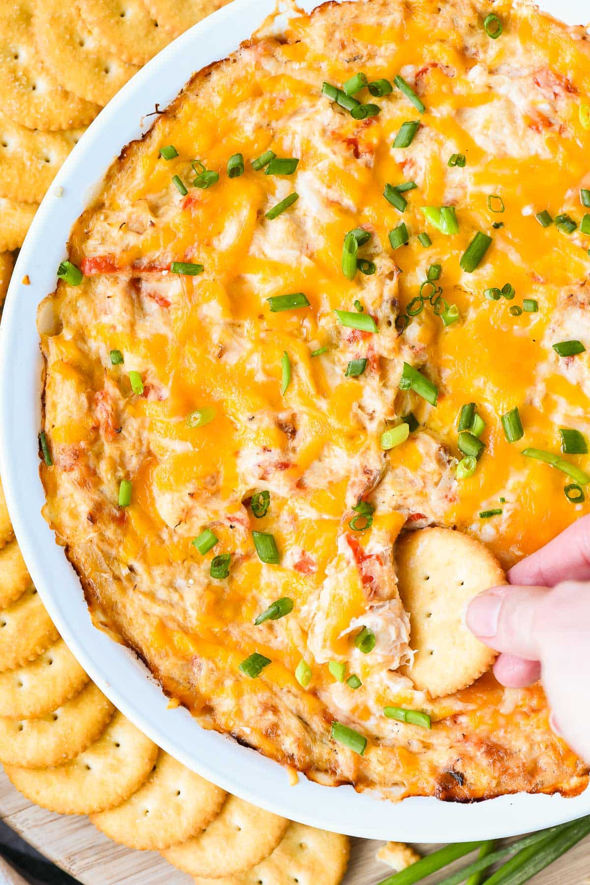 - Spread the dip evenly over the baking dish, and sprinkle with the remaining cheddar and Parmesan cheese. Bake in the preheated oven for 20-25 minutes or until dip is bubbly and cheese is melted. Remove from oven, sprinkle with green onions, and serve with your choice of crackers or veggies.